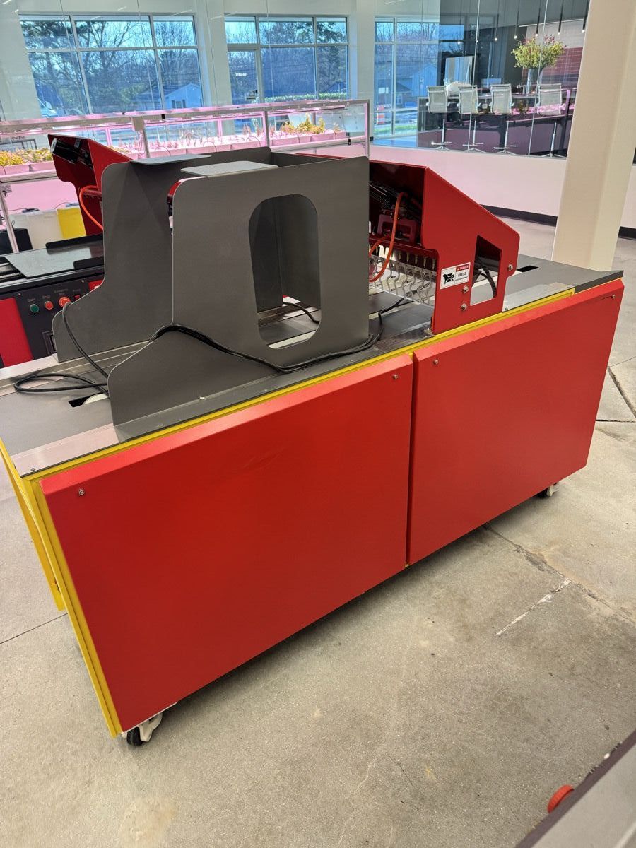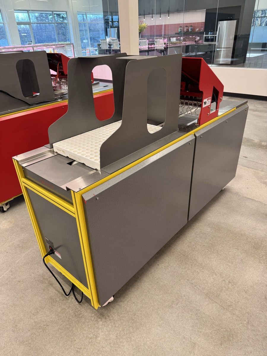 Updated version of HYVE's automated vacuum needle seeder with fully enclosed cabinet design and integrated casters. Precisely places individual seeds into 200-plug trays using vacuum-assisted needle technology. Previously operated in AgEye's facility — being sold to make room for next-generation equipment.
